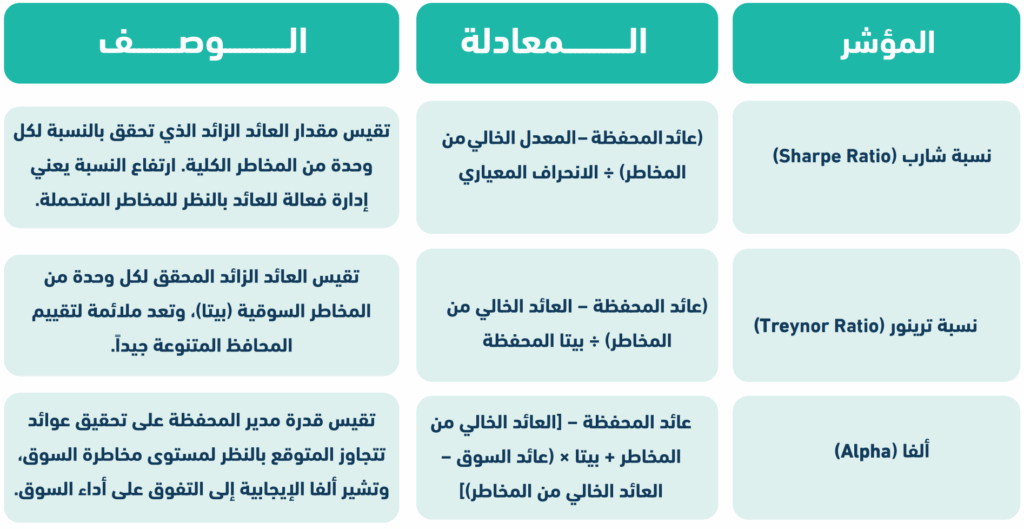 - شرح مؤشرات الأداء المالية الأساسية (شارب، ترينور، ألفا) ومقارنة الأداء بالمؤشرات المرجعية.