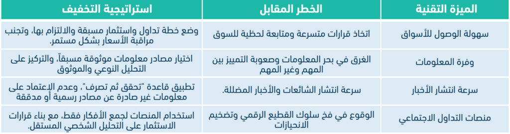 - ســـهولة الوصـــول إلـــى الأســـواق والمعلومـــات، لكنهـــا تحمل مخاطر الشائعات وسلوك القطيع الرقمي.