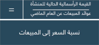 حتى لو لم تحقق المنشأة ربحاً من خلال إدارتها لنشاطها، فإنها تحقق عائدًا في كل مرة تقوم فيها ببيع سلعة أو خدمة. طريقة PSR وتعد نسبة السعر إلى المبيعات لتثمين قيمة المنشأة بناءً على مستوى عوائدها وتقدم هذه النسبة في شكل مضاعف، ويتم حسابها بقسمة القيمة الرأسمالية للمنشأة مقيَّمة بسعر السوق الحالي للسهم على عوائدها المحققة في العام الماضي. فعلى سبيل المثال، إذا كانت القيمة الرأسمالية للمنشأة بسعر السوق الحالي تبلغ ١٠٠ مليون ( ٢٠ مليون سهم x ٥ ريالات لكل سهم ) وبلغت مبيعاتها لآخر اثني عشر شهرًا ٣٠٠ مليون ريال، فإن نسبة السعر إلى المبيعات . تعادل ١٠٠ مليون ٣٠٠ مليون = ٠٫٣٣ PSR