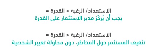 من خلال فهم قواعد تحمل المخاطر يمكن لمدير الاستثمار معرفة ما يتاح له أن يركز عليه. وتبين المعادلتين التاليتين تصنيف المستثمرين على أساس تحمل المخاطر وما على مدير الاستثمار القيام به اتجاههم: