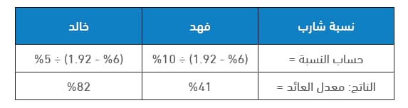 طبقًا للجدول وبعد حساب نسبة شارب لكلا المحفظتين، حقق فهد وخالد العائد نفسه ظاهريًّا عند 6%، لكن خالدًا حقق هذا العائد بمعدل مخاطرة أقل، (يعكسه انخفاض الانحراف المعياري لمحفظته عند 5%)، بينما حقق فهد العائد نفسه، ولكن بمعدل مخاطرة أكبر، ومن ثم فإن محفظة خالد كانت تُدار بشكل أفضل.