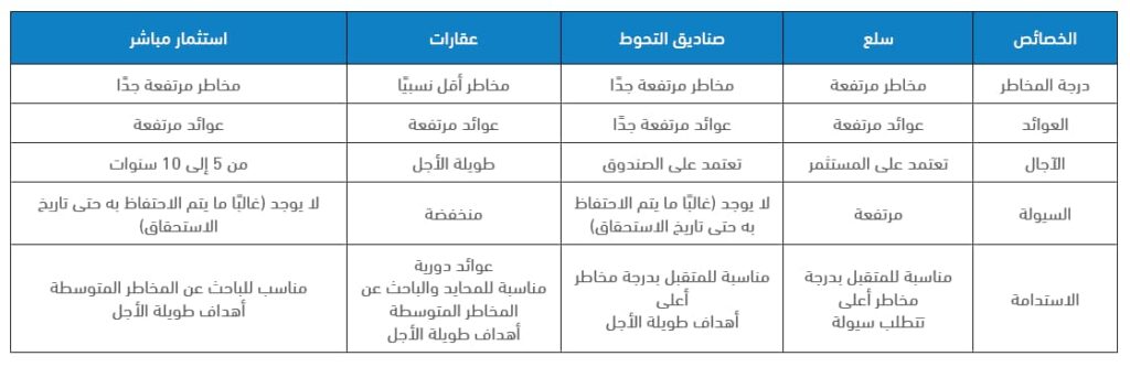 ويمكن بيان الفروقات بين عدة أنواع من هذه الاستثمارات كما في الجدول التالي: