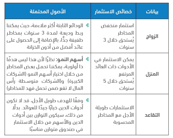 إذا كنت تستثمر المال لهدف مهم (مثل جامعة أبنائك)، لذا ستفضل الاستثمار في أوراق مالية أكثر أمانًا، مقارنة بما إذا كنت تستثمر لشراء سيارة رياضية.
