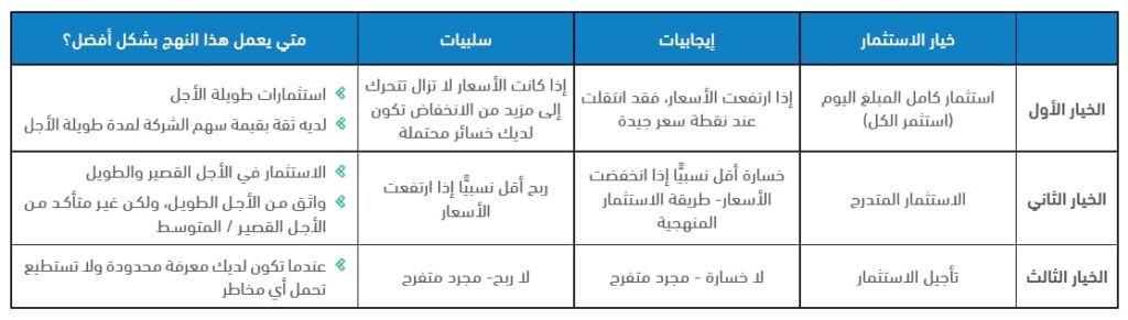 والخلاصة إذا كان المستثمر على يقين من القطاع الذي يود الاستثمار فيه، وأنه قطاع واعد ومُقيَّم بأقل من قيمته فإن استثمار الكل (كامل المبلغ) يكون الخيار الأنسب، وإلا فيكون الاستثمار المتدرج هو الأنسب.