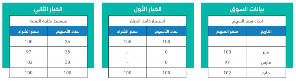بحسب المثال؛ يتبين أن متوسط سعر شراء الأسهم في الخيار الثاني (الاستثمار المتدرج) أقل تكلفة (99.5) ريال من خيار استثمار كامل المبلغ دفعة واحدة (100) ريال.