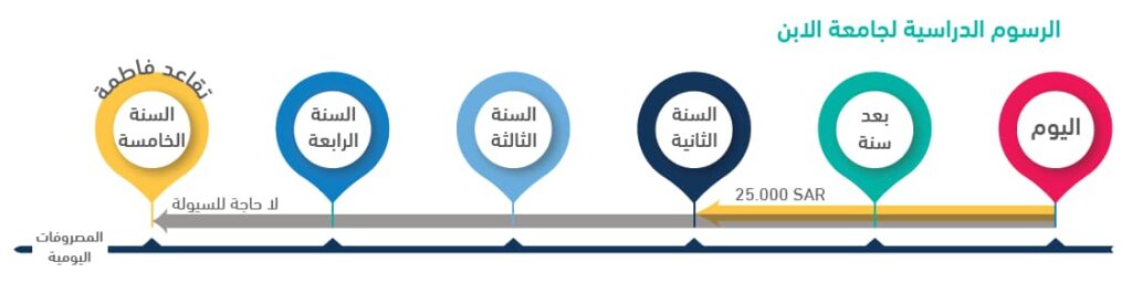 الأهداف متوسطة الأجل: التعليم الجامعي للابن الأصغر- بافتراض أن متوسط الرسوم الدراسية للجامعة ونفقات المعيشة هو 250,000 ريال تبدأ بعد سنتين.